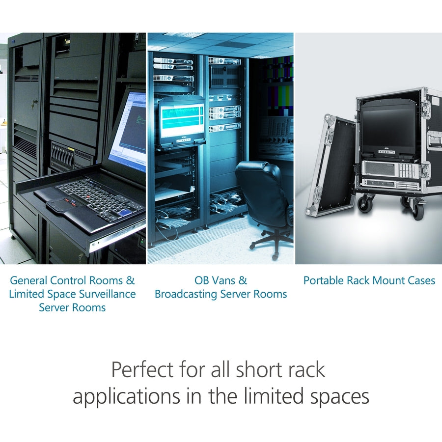 The CL3100 USB VGA LCD Console is a short depth single rail LCD KVM console featuring an 18.5" LED-backlit widescreen LCD monitor with an integrated keyboard and touchpad. The short-depth design fits all 19" equipment cabinets, and is especially suitable for shallow racks. The CL3100 provides an ideal space-saving solution for special environments such as outside broadcast vans (OB vans) and compact control rooms.