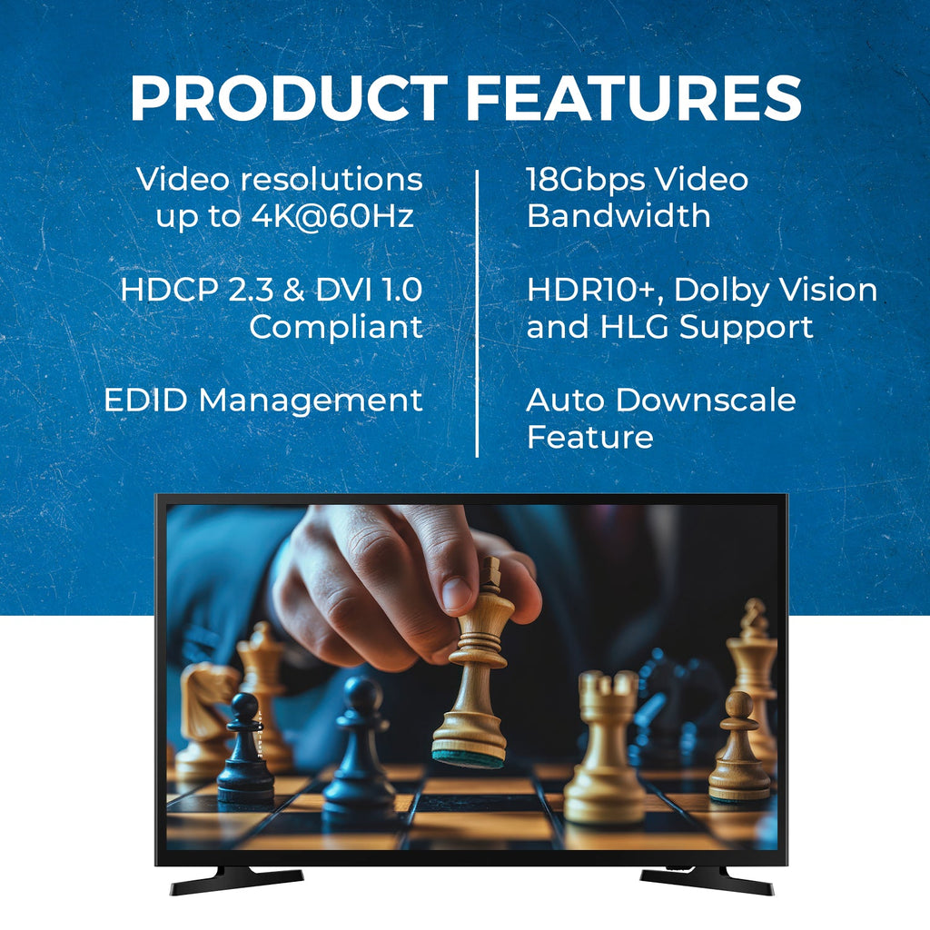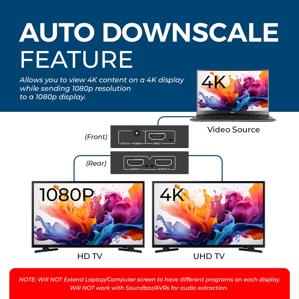 The UHD-PRO102 is a 1 Input 2 Output HDMI Splitter that allows you to connect a single media source to 2 displays, duplicating the content on both screens. The device supports resolutions up to 4K@60Hz and is HDMI 2.0 & HDCP 2.2 compliant. This device is the perfect solution to watch content from a single media source on 2 displays at the same time. Moreover, the device also supports an auto-downscaling function. This allows you to connect a 4K display and a 1080p display at the same time, maintaining the 4K resolution on the 4K display and downscaling the media to 1080p to show on the 1080p display.