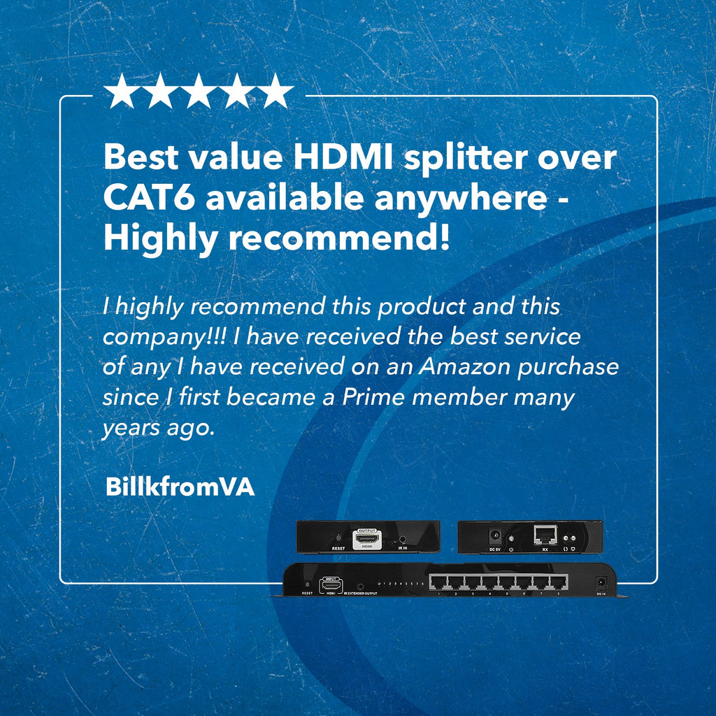 The OREI HD-EX108 1x8 HDMI Extender Splitter includes one transmitter and eight receivers, it extends 1 HDMI source to 8 HDMI displays over a single CAT5e/6/7 cable up to 400 Feet at 1080p. Perfect for Bars, Restaurants, In-Home entertainment system. Advanced EDID Management.
