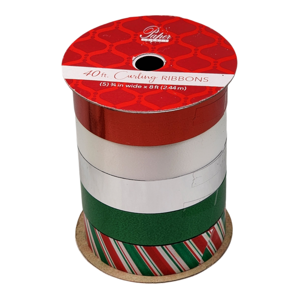 Add a festive touch to your gift-wrapping and crafting projects with this versatile set of Curling Ribbons! This lively assortment features five distinctive designs including vibrant red elegant white shimmering silver and a playful red and white striped pattern. Each roll offers 8 feet of ribbon providing a total of 40 feet of decorative potential all at ¾ inch wide.