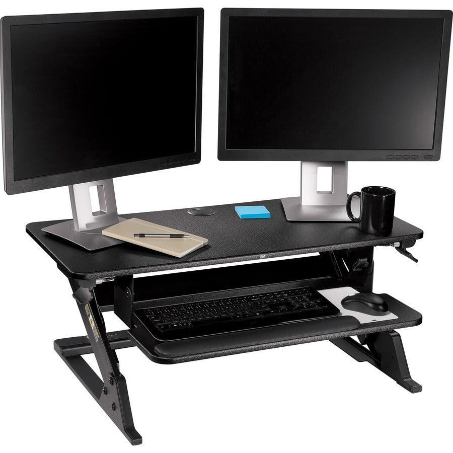 - Gas assist continuous height adjustment allows you to move smoothly and quietly between sitting and standing positions in seconds. - Height adjustment range from 6.2” to 20” above the desk accommodates a wide range of users. - +10⁰/-10⁰ keyboard surface tilt to help achieve comfortable typing position. - Primary work surface is large enough to fit two 24” monitors and holds up to 35 lbs. - Includes 3M™ Gel Wrist Rest for your keyboard and 3M™ Precise Mouse Pad. - Includes 45% post-consumer recycled content. - Pre-assembled solution eliminates need for installers.