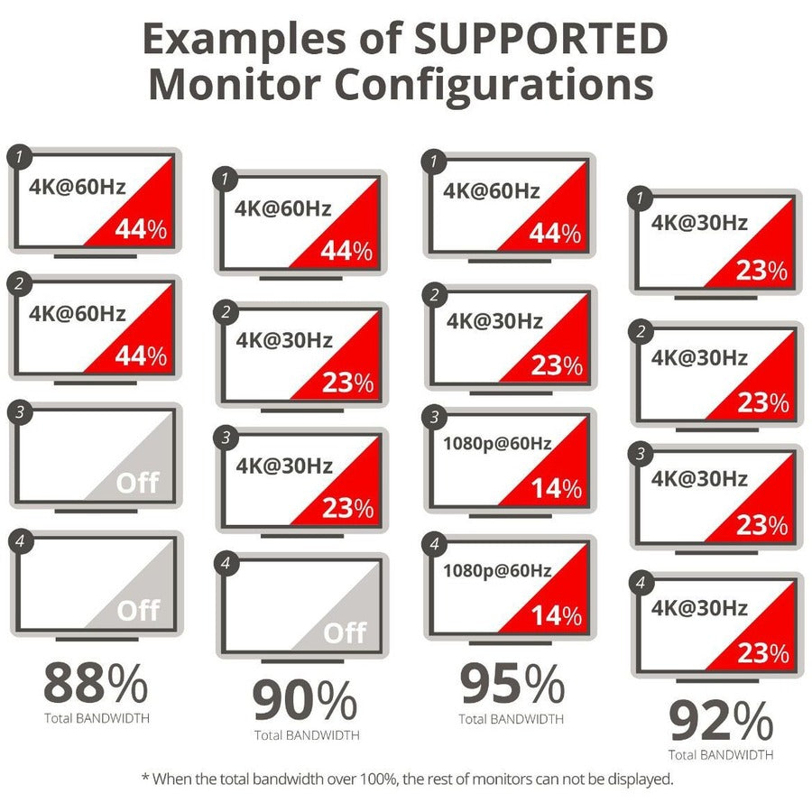 - Total Bandwidth 32.4Gbps (max): Supports one UHD 8K (7680 x 4320)@30Hz display, two 4K@60Hz displays, three or four 4K (3840x2160)@30Hz or less display. Other resolution combinations which are less than or equal to 4K@30Hz will work also. For example, four 2K, four 1080p, 4K+2K+1080p+1080p etc. Note: The total combined bandwidth among all connected displays must NOT exceed the total maximum bandwidth of 32.4Gbps