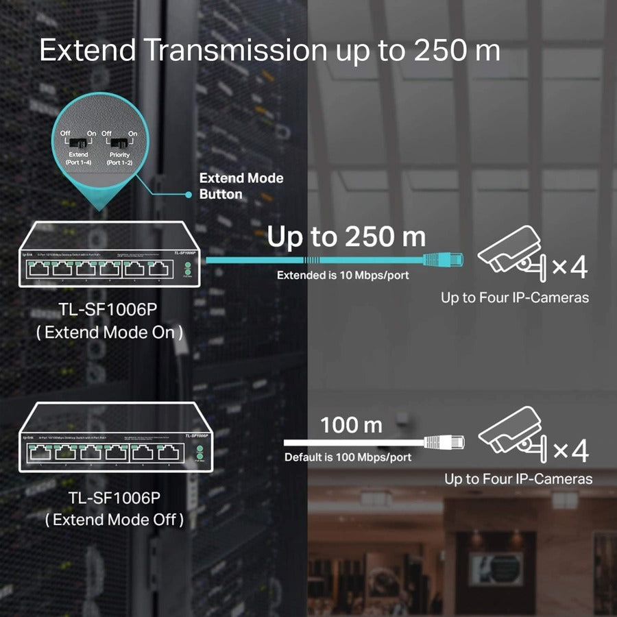- Extend Mode: Up to 250m data and power PoE transmission range under Extend Mode, ideal for surveillance system (Speed will be downgraded to 10 Mbps).