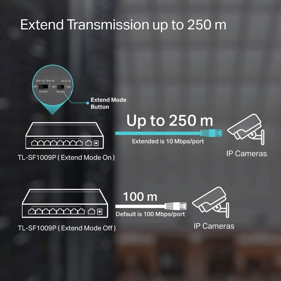 - Extend Mode: Up to 250m data and power PoE transmission range under Extend Mode, ideal for surveillance system (Speed will be downgraded to 10 Mbps).