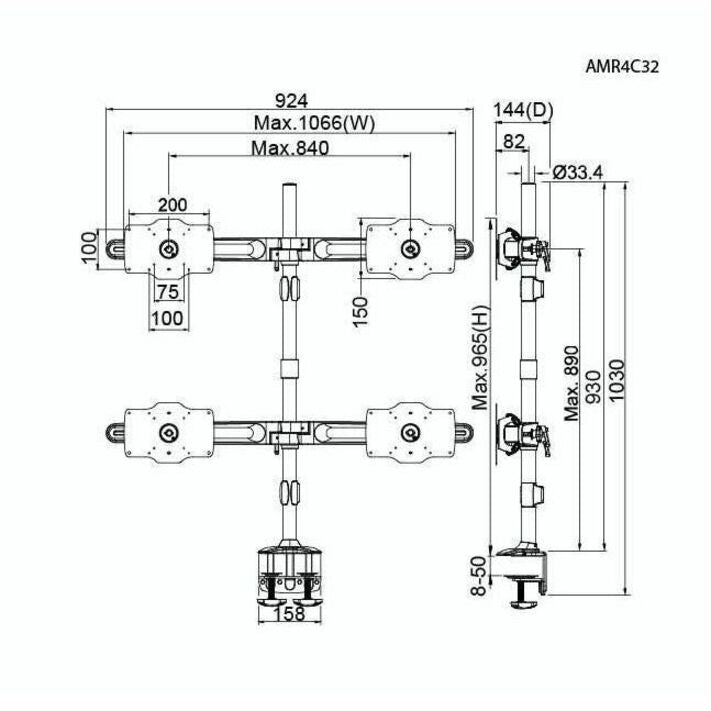 Amer Mounts Clamp Based Quad Monitor Mount For Four 24"-32" Lcd/Led Flat Panel Screens