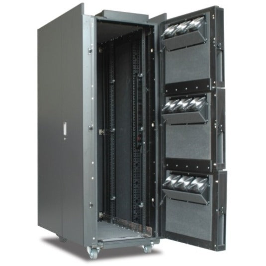 - Acoustic foam lining for noise dampening Superior noise reduction of installed IT equipment allowing the enclosure to be placed in a quiet environment. - Adjustable equipment mounting rails The equipment mounting rails, front and rear, are fully adjustable for various mounting depths, for rear-facing equipment mounting or additional clearance from the front door. Maximum rack depth 88 cm/34.6 in. Minimum rack depth 12 cm/4.7 in. - Four vertical 0U accessory channels and cable containment brackets Provides multiple mounting locations for cable management accessories and rack PDUs without using critical equipment space. - Integrated heat removal High efficiency fan modules remove heat and eliminate the need to purchase a costly cooling unit for your IT equipment. - Integrated power distribution Provided with a rack power distribution unit servers and other equipment are ready for deployment. - Light oak veneer finish The enclosure blends discretely into almost any office environment. - Removable side panels Provides customers with easy accessibility to equipment.