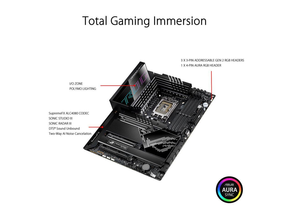 Intel Z690 ATX motherboard with 20+1 power stages, DDR5, Five M.2, USB 3.2 Gen 2x2 front-panel connector, Dual Thunderbolt 4, PCIe 5.0, Onboard WiFi 6E and Aura Sync RGB lighting