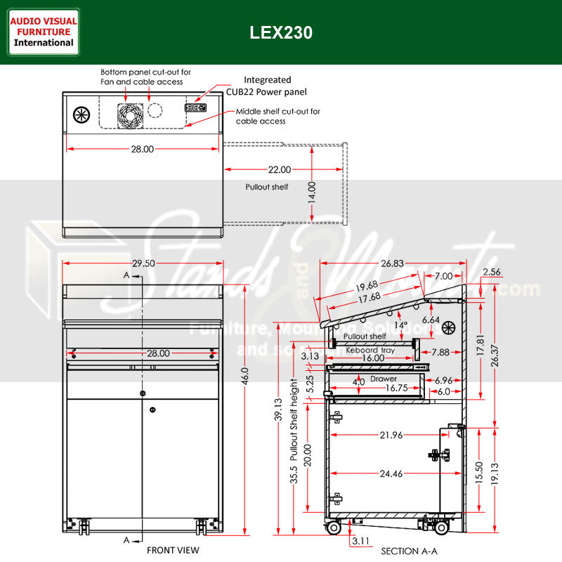 - The Thermowrap panels, available in various colors, are highly durable. The work surface measures 29.5" W x 17.68" D and features a pen/paper stop. The lectern also includes a Power Panel with 2 outlets and Dual 2.0A USB fast charging, as well as a grommet. A spacious front drawer with a locking mechanism and keyboard shelf, along with a 22" W x 14" D pull-out side shelf, provide ample storage space. The lectern's front doors can be locked for security, while the rear doors have a hidden lock for easy access. Heavy-duty casters, two of which can be locked, make it easy to maneuver the lectern. It comes fully assembled and can also be customized with cutouts for electronics or other specified items.
