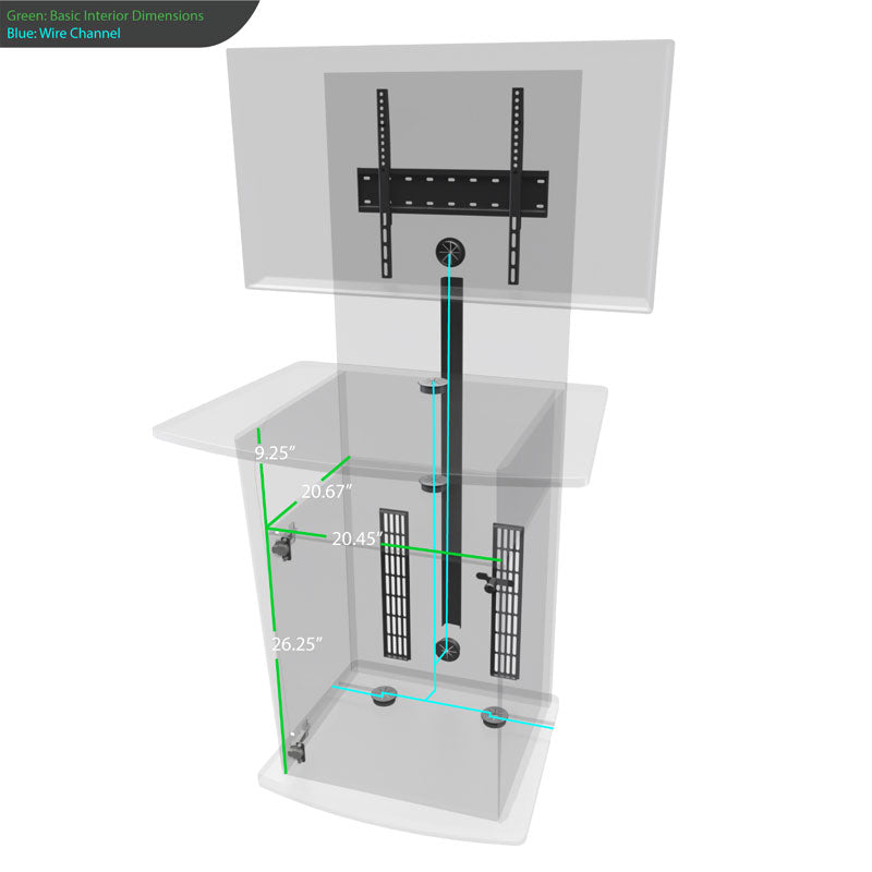 Audio Visual Furniture KS90 is an information kiosk engineered for public use with a wide flat top work surface and interior storage for housing electronics while providing ventilation. It features: