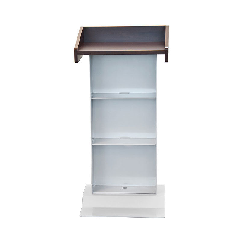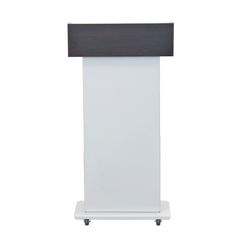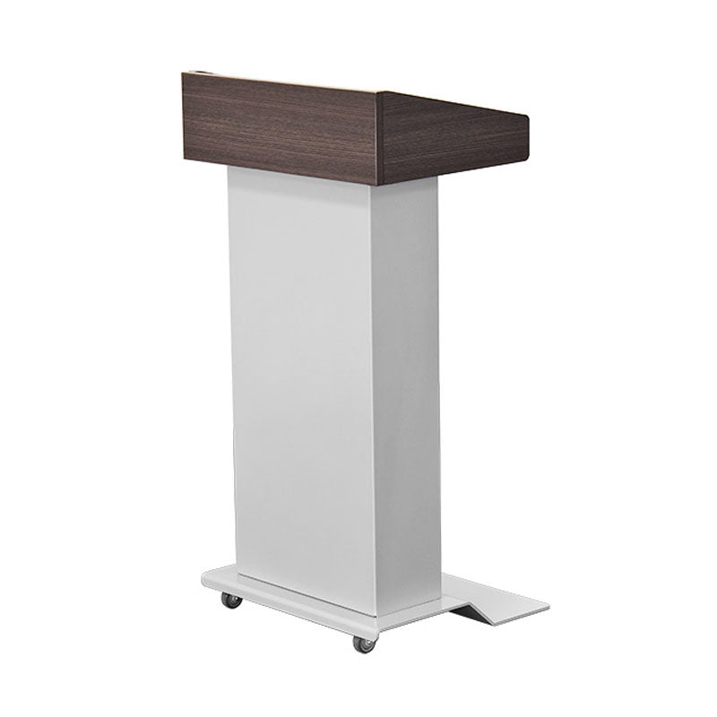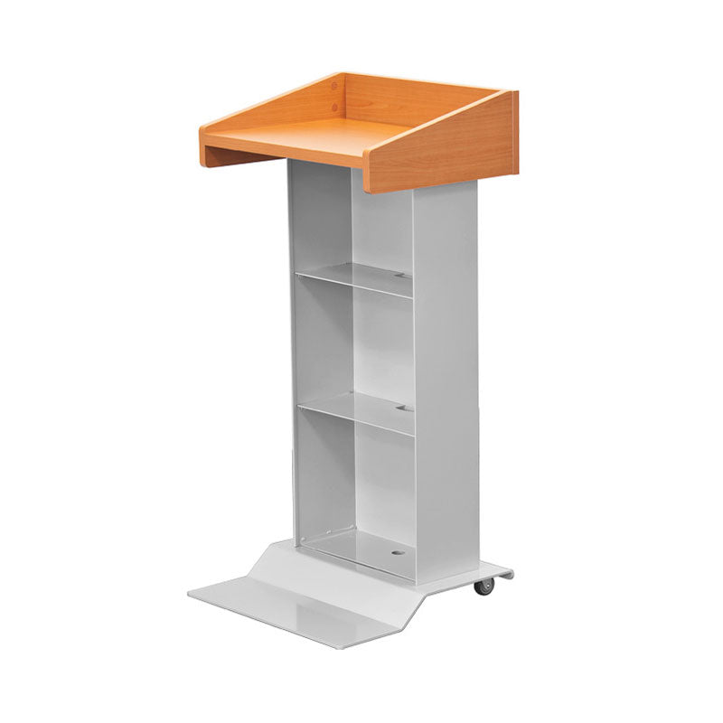 Crafted with furniture grade laminate in a variety of finishes, this modern mobile lectern features a sleek Silver body and base. The accessible base design allows for close access and provides a large footprint for a stable foundation. With a spacious 21" X 16" working surface, this lectern offers ample room for speaker notes, books, and other materials. It also includes 2 interior shelves for convenient storage of notes or a glass of water. The unit also features a cable pass through, ensuring that all cables are neatly tied and organized on the inside. Plus, with 2 front wheels, this lectern can easily be moved to any desired location. Arriving fully assembled, it is ready to use right away.