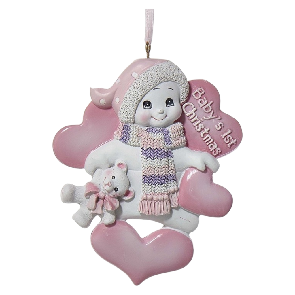 Celebrate a special milestone with our "Baby's 1st Christmas" ornament, a charming keepsake that captures the joy of your little one's first holiday season. This adorable ornament features a smiling snowbaby dressed in a cozy hat and scarf, accompanied by a cute teddy bear, both exuding warmth and cheer. The soft pink hearts and delicate details make it a perfect addition to your festive decorations, commemorating this memorable occasion with sweetness and style.
