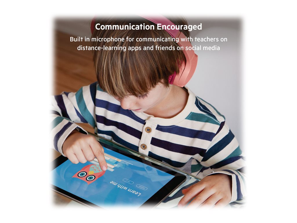 Premium-quality SoundForm headphones, reimagined for kids with distance learning, travel, and streaming online content in mind. These mini wireless on-ear headphones are kid-friendly in every way, from their volume cap of 85 dB, to their easy-to-use controls and durable oops-proof design. With up to 30 hours of non0stop playtime, the headphones will last all through the school week and are tested to work with today's most popular learning devices and apps.