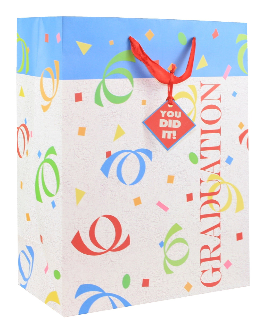 Celebrate the special achievement of your graduate with the cheerful Confetti Graduation Gift Bag! Measuring 13 inches high, 10 inches wide, and 5 inches deep, this vibrant gift bag offers ample space for gifts, cards, and thoughtful surprises. The bag features a lively design with colorful confetti and festive patterns, highlighted by bold "GRADUATION" lettering, creating a joyful ambiance that perfectly matches the celebratory spirit of graduation day.