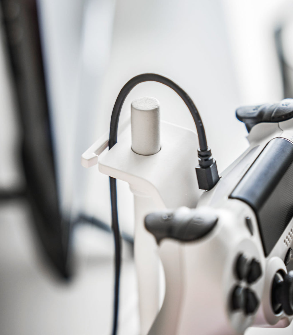 This controller organizer is modern, minimalist, and convenient. The height of each level can be easily adjusted by the rubber rings that each platform rests on. Each level can also spin around the axis of the sturdy steel rack, giving you ultimate flexibility with this gaming station. Three tiers for storing game controllers, headphones, or handheld electronics. Special hooks hold wires in place, acting as a charging station for your devices.