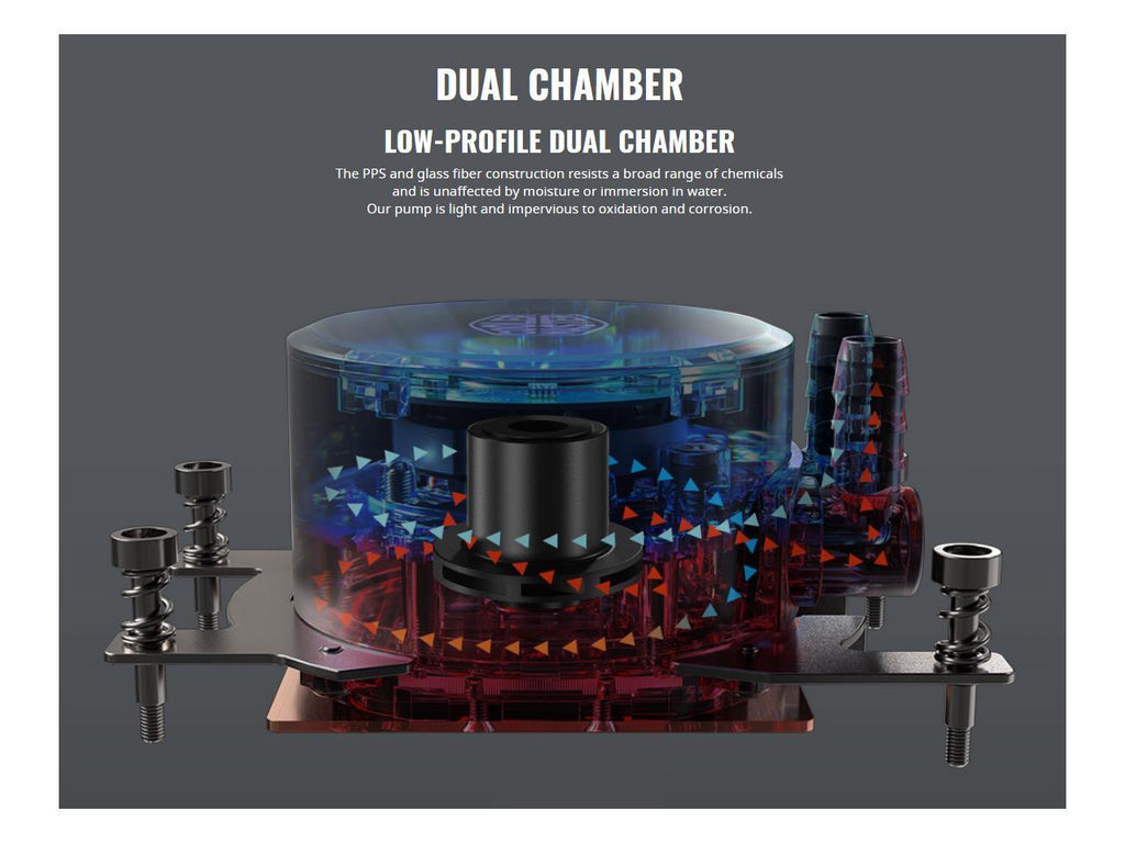 - Dual Dissipation - Our low-profile dual chamber pump delivers sizable performance leaps over last-gen technology.