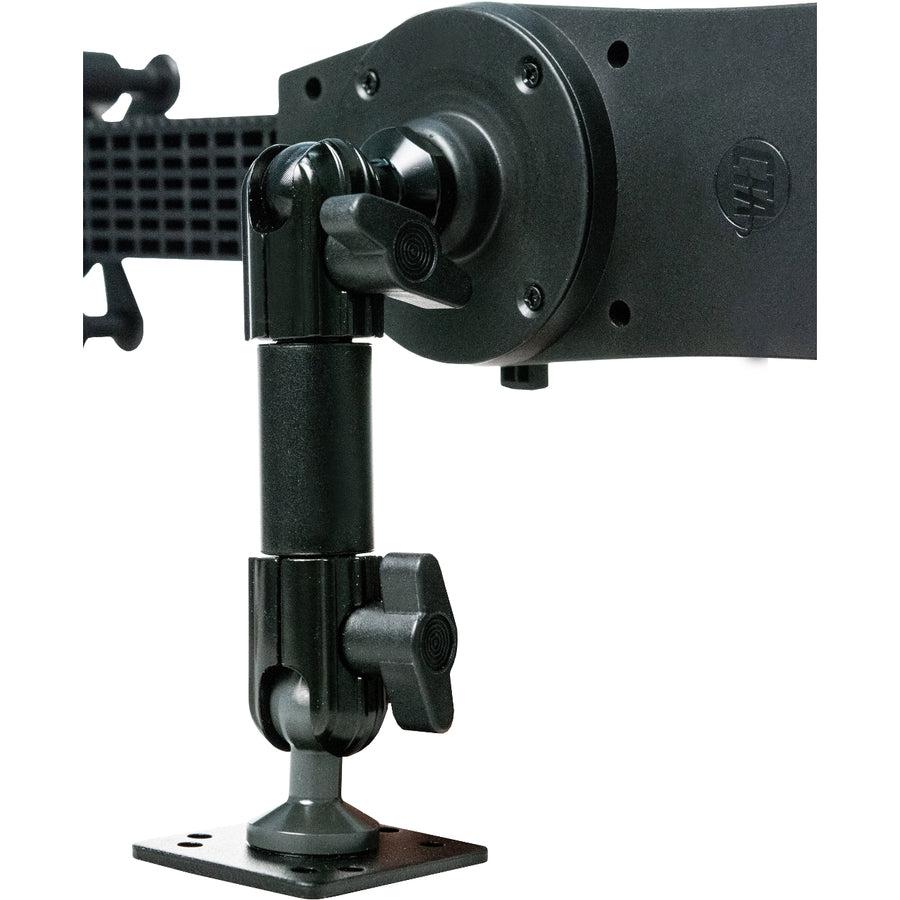 This compact mount makes your tablet accessible and maneuverable while occupying minimal space. The sturdy mount base installs easily to your dashboard, wall, or countertop via a standard AMPS pattern, supporting a heavy-duty carbon fiber support arm. At both the top and bottom ends of this arm are tension-adjusting ball socket joints to give you an enormous range of angle options, plus the means for portrait and landscape display orientations. Your tablet is secured inside the unique slide-adjustable tablet holder. The open style holder design allows full access to your tablet’s ports, buttons, and headphone jack for card reader compatibility.