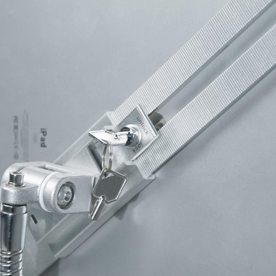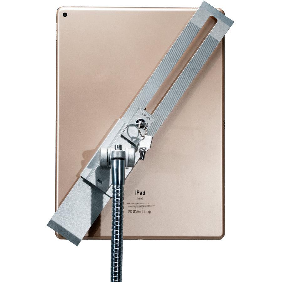 - Flexible, sturdy gooseneck adjusts to any position - Jointed tablet holder tilts side to side and rotates 360 degrees for landscape and portrait viewing - Lock and key security system keeps your tablet protected - Telescoping pole allows easy height adjustment - Attachable battery-pack cradle - Stable, weighted metal base - Durable, easy-rolling swivel casters - Compatible with 7-13 inch tablets, including iPad mini, iPad Air, iPad Pro 12.9, and Surface Pro 4