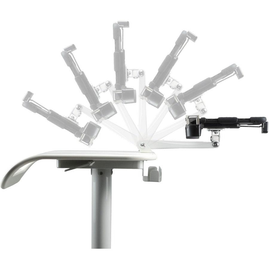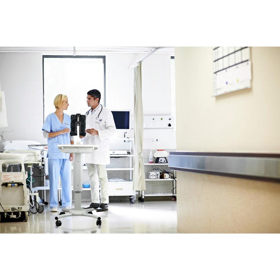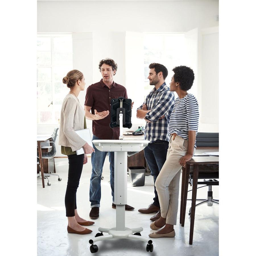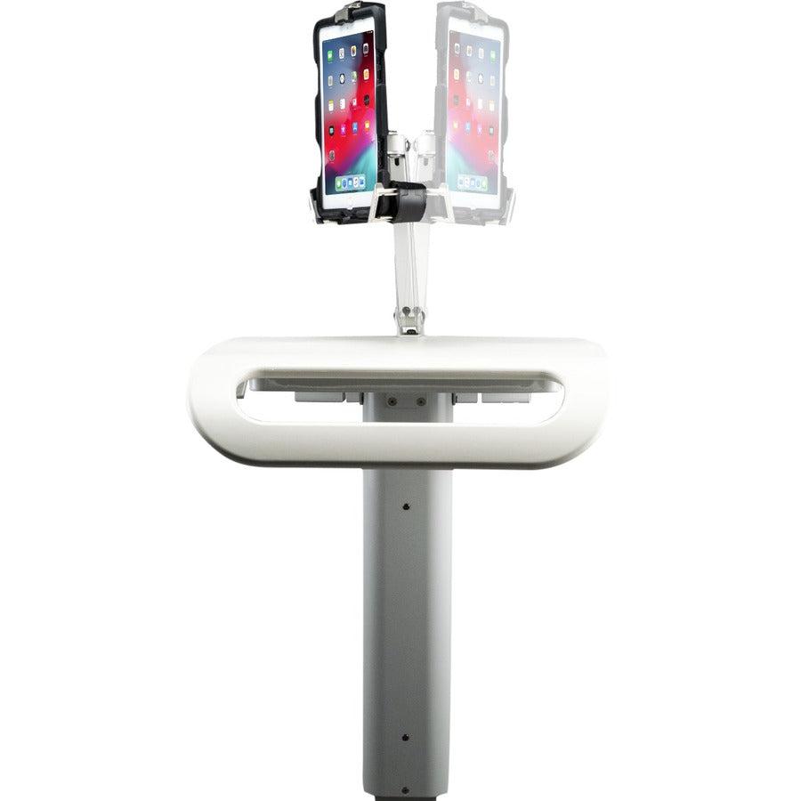 This workstation cart gives you nearly limitless angle-adjustment and all of the mobility of a smaller wheeled stand, making it a perfect addition to a nurse’s station, classroom, tradeshow, or conference room. Your tablet is secured by a unique tri-grip adjustable holder, which tilts and rotates 360 degrees on an angle-adjustable arm. Your tablet stays locked in place with a steel security cable, which locks the holder shut and anchors the holder to the cart or other permanent fixture.