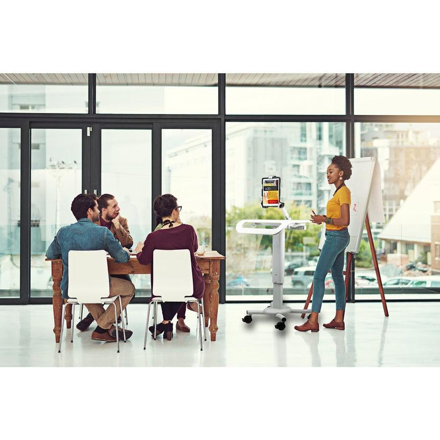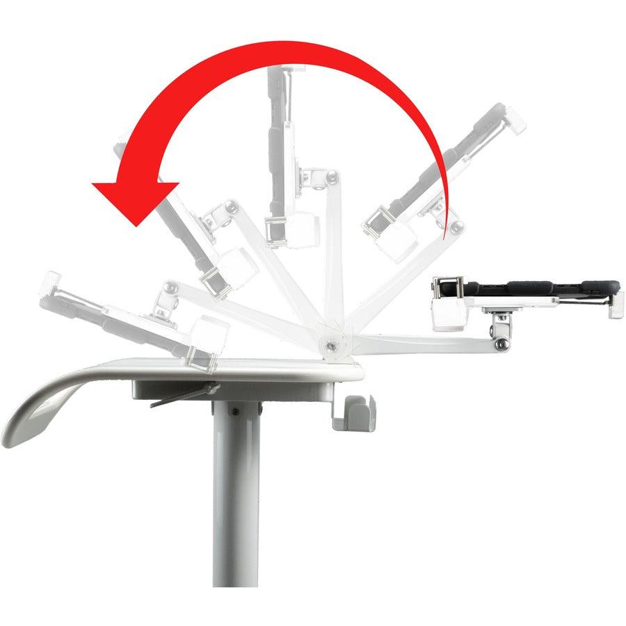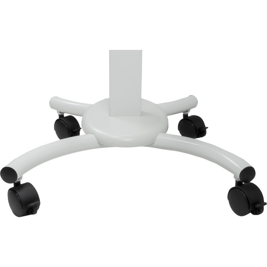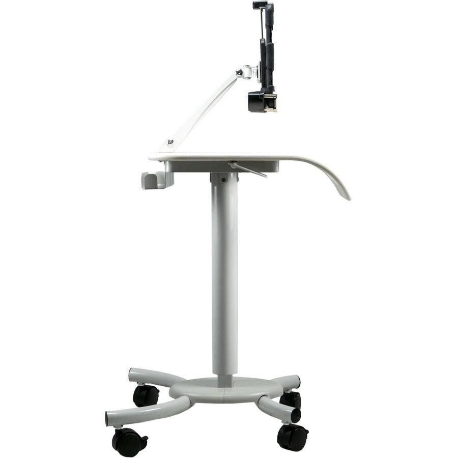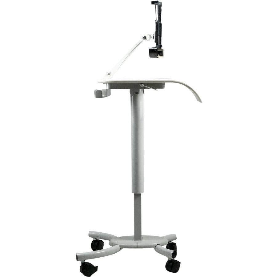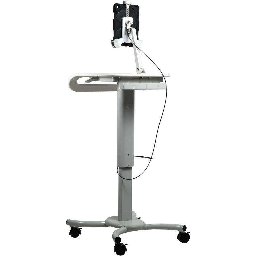 The tablet stand’s arm is attached to the end of a spacious work surface, perfect for a keyboard, power supply, or other accessories. A dedicated power-strip compartment located underneath ensures that your charge cables stay connected and out of sight. The cart also features a smooth, intuitive standing desk style height-adjustment mechanism. Simply grab the two adjustment handles on the cart’s underside, and gently pull to achieve your desired height. 4 attachable, locking swivel casters give you easy rolling on flat surfaces.