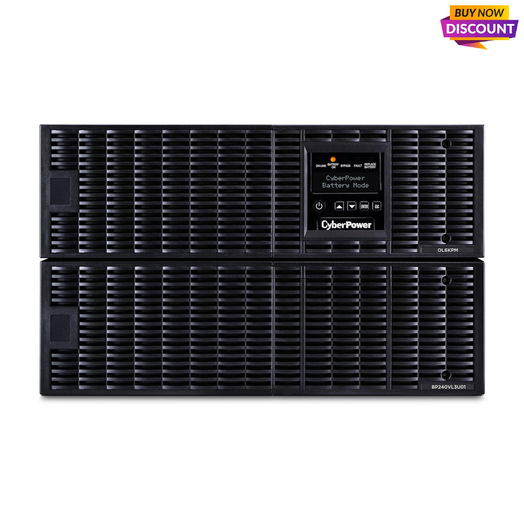 This UPS can use the BP240V30ART3U or BP240VL3U01 extended battery module for more runtime. The OL6KRT comes with a three-year warranty (including batteries) and a $300,000 connected equipment guarantee.