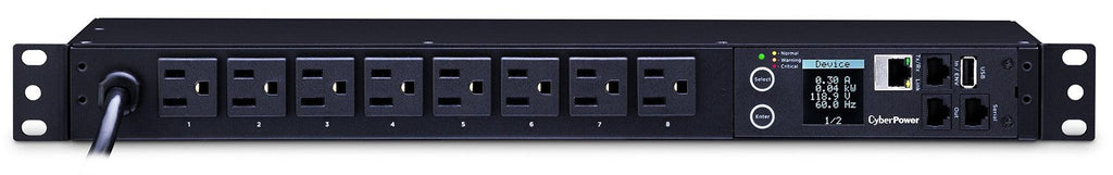 The CyberPower PDU31001, an 8-outlet (front), 1U rackmount monitored power distribution unit (PDU) provides 120V 15A output. PDU31001 distributes power to 8 NEMA 5-15R receptacles from a single NEMA 5-15P plug with unfiltered electrical pass-through. Monitor power status over the network by using the CyberPower management console and the RJ45 Ethernet port for network connection. Monitor power status locally by using the LCD. The PDU31001 comes with a three-year limited warranty that covers defects in materials and workmanship in the product under normal use and conditions.