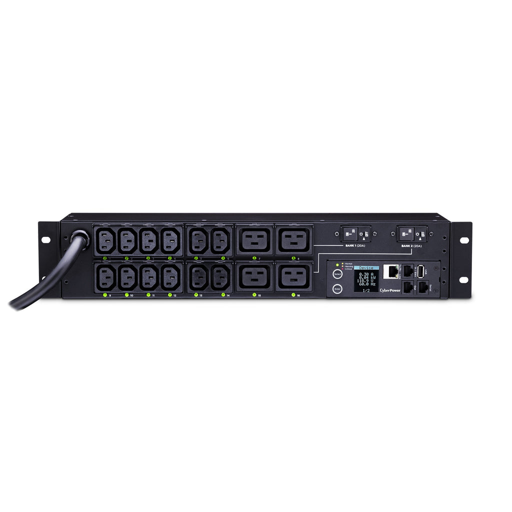 CyberPower PDU41008. PDU types: Switched, Rack capacity: 2U, Type: Single-phase. AC outlets quantity: 16 AC outlet(s), AC outlet types: C13 coupler, C19 coupler, Power plug: NEMA L6-30P. Cable length: 3.7 m, Certification: UL 60950, FCC A. Monitoring: Current, Power, Voltage, Management protocols: IPv4, TCP/IP, UDP, SNMPv1, HTTP, NTP, DNS, Telnet, DHCP, SMTP, FTP, IPv6, SNMPv3, HTTPs, SSH, SSL,..., Firmware upgradeable via: Network, USB. Nominal input voltage: 200-240 V, Maximum current: 30 A, AC input frequency: 50 - 60 Hz