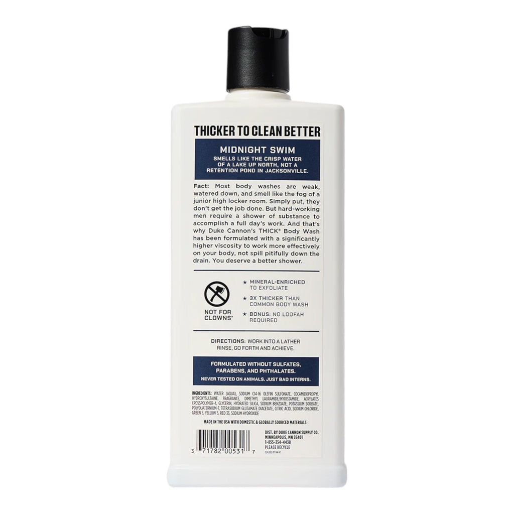 Transform your shower experience with Duke Cannon's Thick Body Wash in the soothing Midnight Swim scent. This robust 18-ounce bottle is formulated to deliver a superior clean, designed for the modern man who appreciates luxury in his grooming routine. Infused with the calming aromas of sandalwood and lavender, this body wash captures the essence of a tranquil night spent by the water, creating an aromatic escape that lingers long after your shower.