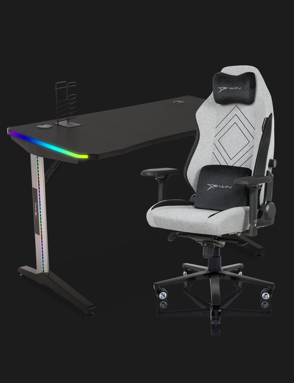 E-WIN Sound-Synced RGB LightingStep up your gaming ambiance with E-WIN's responsive RGB effects. As the sounds around you rise and fall, watch the lighting dynamically adapt in intensity and height. Just connect via USB and let your gaming sessions pulse with the rhythm of the action on the E-WIN gaming desk.E-WIN 2.0 Carbon Fiber Strength Gaming DesktopDive into expansive gaming on a surface spanning up to 48 inches in width, crafted from high-strength carbon fiber. Every inch is meticulously detailed with thousands of micro-level, light-reflective points, ensuring unparalleled tracking precision for next-gen gaming mice.Dual-Mode Wireless & USB ChargerElevate your E-WIN Gaming Desktop experience with our versatile 2-in-1 charger. Whether you prefer plugging in with USB or going completely wireless, we've got you covered. Charge up and game on, the choice is yours.E-WIN RGB Gaming Desk - Take Gaming to the Next LevelWe've Assembled The Ultimate Gaming Desk Configuration Available To Provide A Superior Gaming Experience. It's Time To Level Up.High-strength Aluminum Material Framed Legs for Maximum StabilityE-WIN RGB gaming desk is made of high-strength aluminum frame leg for maximum stability, and this ensures that your gaming rig is kept safely above the ground, away from dust and dirt.5° ERGONOMIC INCLINEGame longer with our ergonomic incline keyboard and mouse area. Having a ergonomic gaming desk is crucial for gaming for long periods of time. This gaming deskwas design to improve arm and wrist alignment, which reduces injury from using a keyboard and mouse for hours on end. Includes a large gaming mouse pad.