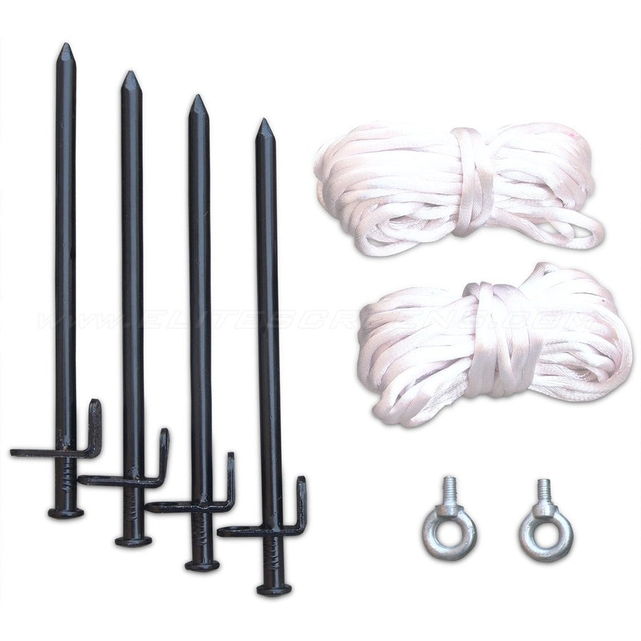 - Features a fully tensioned, snap button frame that ensures a flat projection. Includes: single-piece aluminum frame, screen material, carrying bag, ground stakes, rigging cord, and support rings.