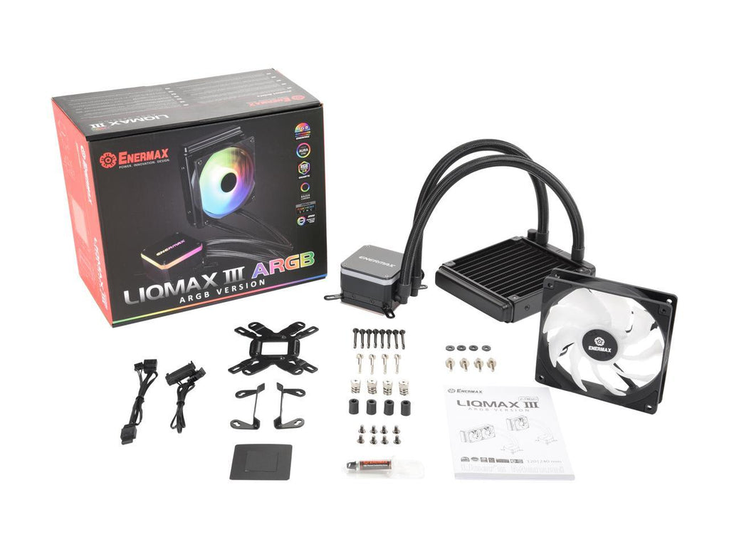 The Enermax Liqmax III ARGB 120 brings excellent cooling performance, quiet operation and gorgeous addressable RGB lighting to your gaming rig. Dual-convex blade fan delivers high-pressure airflow, while the combination of patented Central Coolant Inlet structure and Shunt-Channel-Technology on the Aurabelt water block helps eliminate heat surge and buildup. Both the fan and the Aurabelt water block support addressable RGB lighting, and can synchronize with motherboards that have an addressable RGB header. Installation is quite easy with the included universal mounting system.