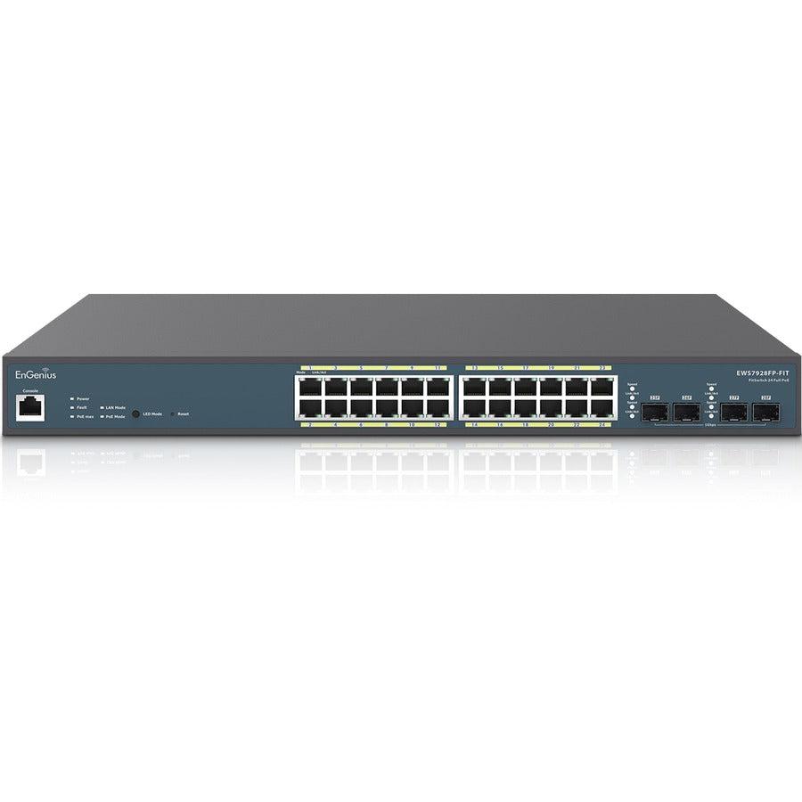 The EnGenius Fit Managed Switch EWS7928FP-FIT is a 24-port Gigabit PoE+ Layer 2 plus switch with a 410W PoE budget and 4 SFP uplink ports. It offers multiple management options for small business network environments, allowing you to select the cloud or on-premises management option that best suits your needs. With its business-class features, the EnGenius Fit managed switch provides secure, reliable, and high-performance switching while reducing capital and operating expenses for cost-conscious small businesses.
