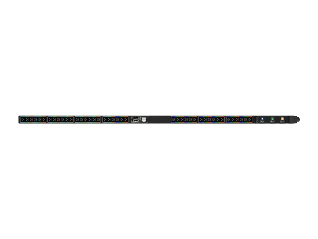 The Vertiv Geist VP4UU0A1 is a vertical rack power distribution unit with a universal input that supports common AC power configurations. It has (30) Combination C13/C19 outlets providing 11kW of power capacity. This unit can accommodate input power ranging from 16A-48A and 208V-415V in both single-phase and three-phase configurations. It helps simplify the rPDU procurement process since users can use a single model to work with different power sources. It is integrated with the Vertiv Geist Next Generation Interchangeable Monitoring Device (IMD). It has a 128x128 high-contrast LCD that displays the power usage. It features enhanced security with a secure boot that helps protect data and operations. It also has a redundant power-sharing port that connects two IMDs in the rack and provides backup power in case of power loss. The units are Dual Listed (UL/CE), TAA-Compliant, and individually tested for functionality and reliability.