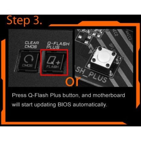 With GIGABYTE Q-Flash Plus, you don’t need to install CPU, memory and graphics card nor enter the BIOS menu to flash the BIOS. Just download and save a new BIOS file (rename to gigabyte.bin) on the USB flash drive, then press the dedicated Q-Flash Plus button and you’re good to go!