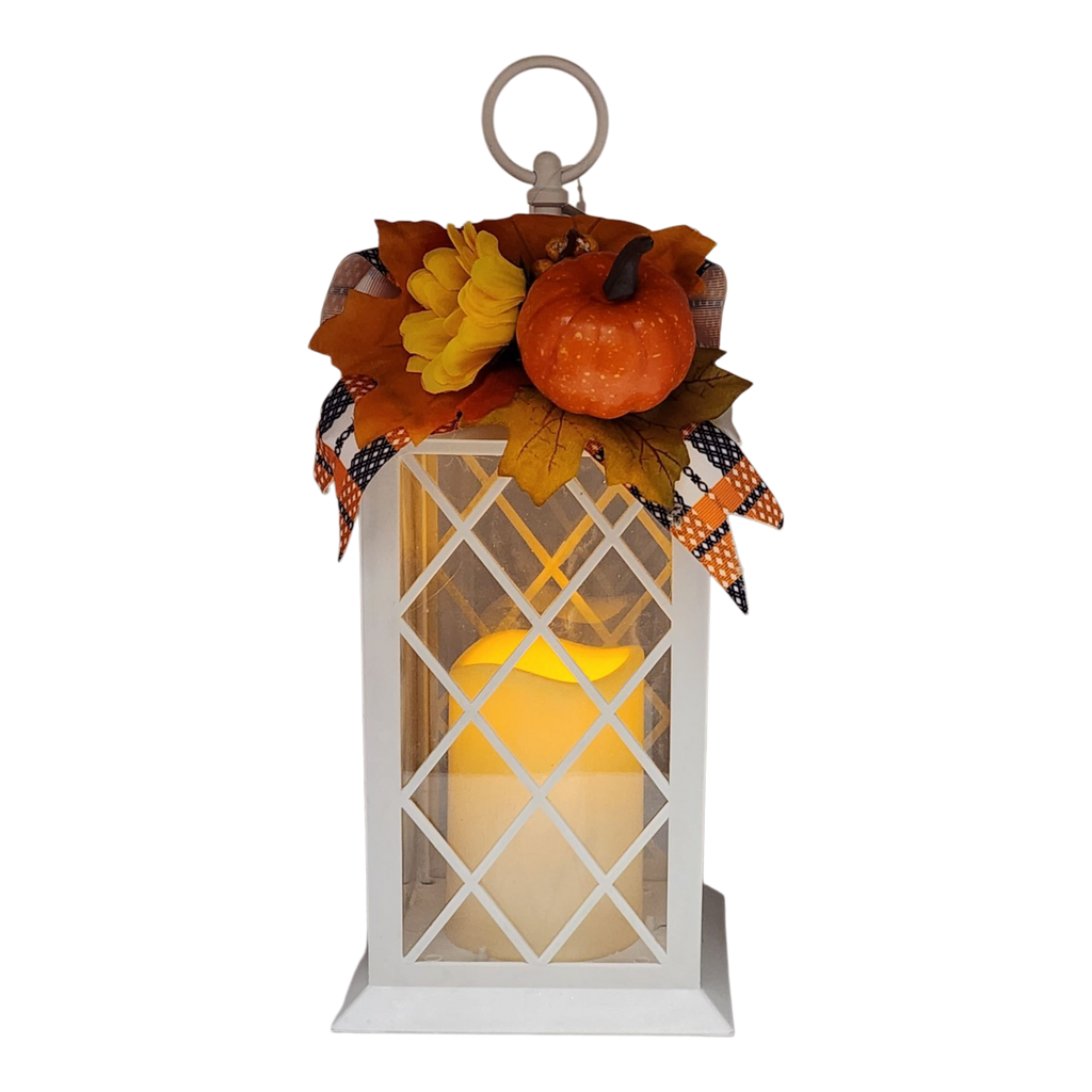 Illuminate your fall decor with the charming Autumn Lantern with Flickering Candle! Standing at 11.2 inches tall, this delightful lantern features a classic design with a lovely white finish, adorned with a beautiful arrangement of autumn leaves, sunflowers, and a tiny pumpkin at the top. The warm glow of the flickering candle inside creates a cozy ambiance that perfectly complements the spirit of the season.