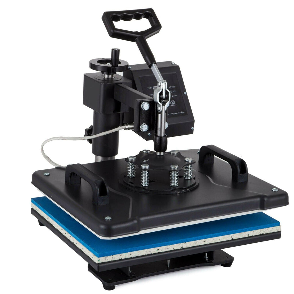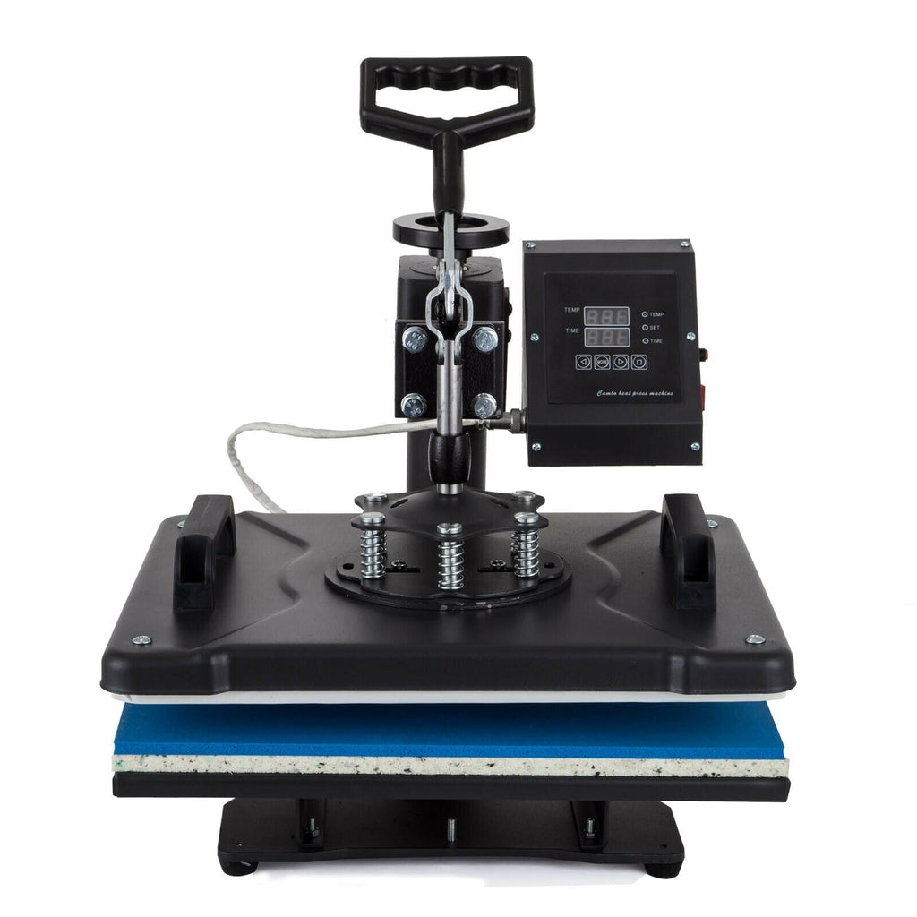 This 8 in 1 heat press machine can be used for T-shirts, caps, ceramic plates, ceramic tiles, mugs, coasters, mouse pads, jigsaw puzzles, lettering, other misc. fabrics & materials. It can transfer colorful pictures and characters of sublimating and dissolved printing ink onto ceramics, glasses and textiles such as cotton, flax, chemical fiber, nylon, etc. This all-in-one press includes flat platen, mugs and plates. The swing-away heat press boasts all of the must-have attachments. It has a built-in Teflon coated 12" x 15" (38X30cm) heat platen with a full range of heating coils to allow for consistency throughout its surface. The digital timer control is adjustable up to 999 seconds. The features a digital temperature gauge ranging from 0 - 250ºC (about 430ºF).