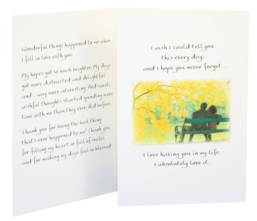 Inside Message: Wonderful things happened to me when I fell in love with you. My hopes got so much brighter. My days got more distracted and delightful and...way more interesting. And sweet, wishful thoughts started spending more time with me than they ever did before. Thank you for being the best thing that's ever happened to me! Thank you for filling my heart so full of smiles and for making my days feel so blessed. I wish I could tell you this every day, and I hope you never forget...II love having you in my life, I absolutely love it.