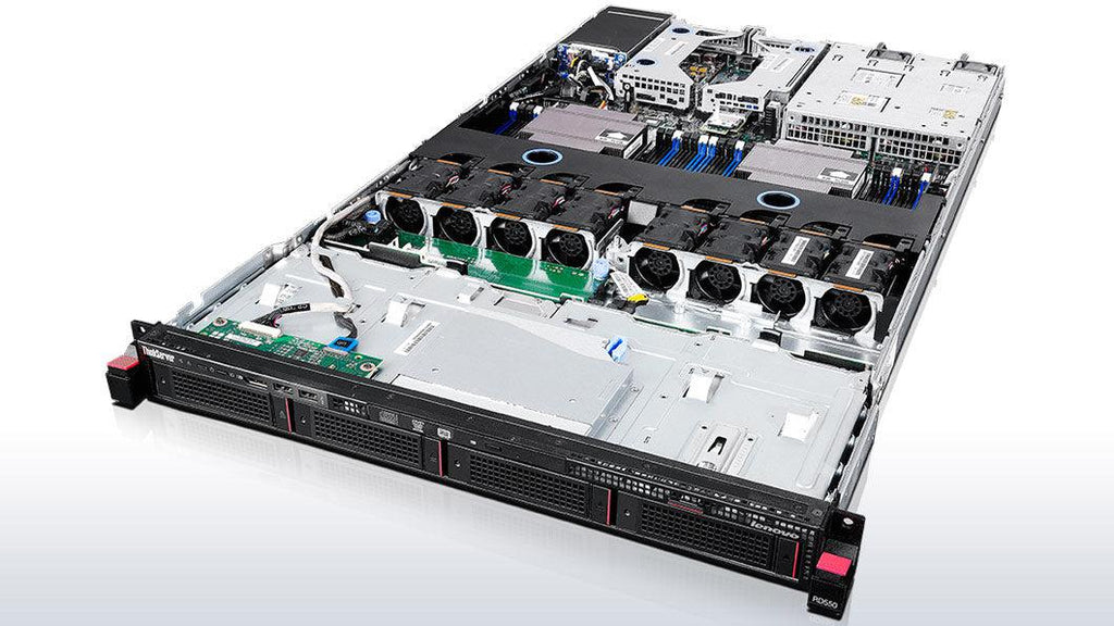 Extremely Versatile Storage Innovation is built in to the ThinkServer RD550. A cleverly engineered design allows more storage density and I/O connectivity than ever before—giving you the performance and capacity of a 2U system in a 1U form factor. By creating smaller drive trays and a slightly larger chassis within the same 1U space, the RD550 offers a total of up to 12 bays, which can be used for data storage or better performance. Two additional enterprise-class M.2 solid-state drives (SSDs) are available as an option for secure booting, as well as SD card options for hypervisor booting. Plus, for ultimate performance, the industry-unique Lenovo AnyBay design allows multiple storage types in the same drive bay, including front-accessible PCIe SSD.
