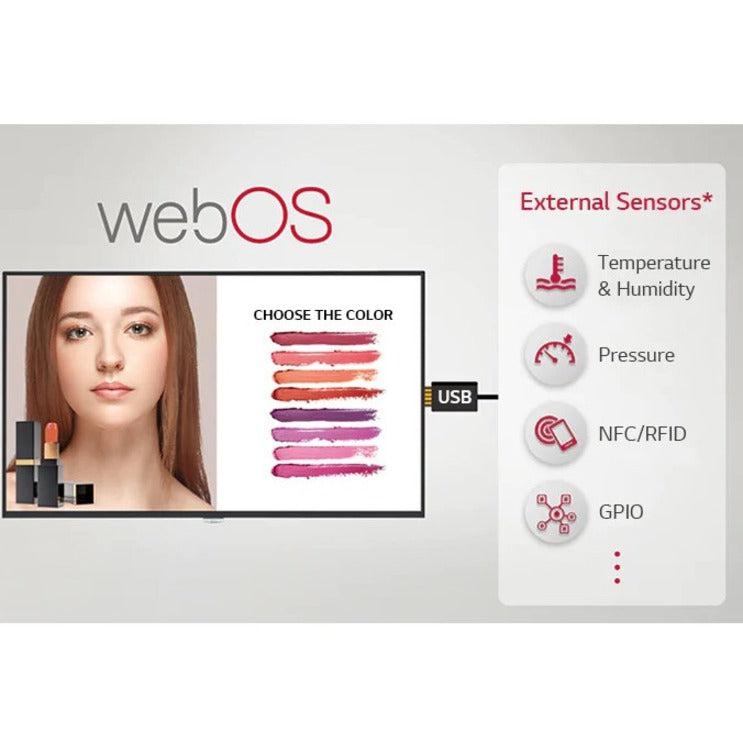 webOS SMART SIGNAGE PLATFORM Various Sensor Connection LG webOS smart signage platform helps to easily provide value-added solutions by supporting simple connections with external sensors such as GPIO, NFC/RFID, temperature sensors, etc. via USB plug-in. Also, the cost for additional software or media players can be saved by reducing the needs for purchasing them.