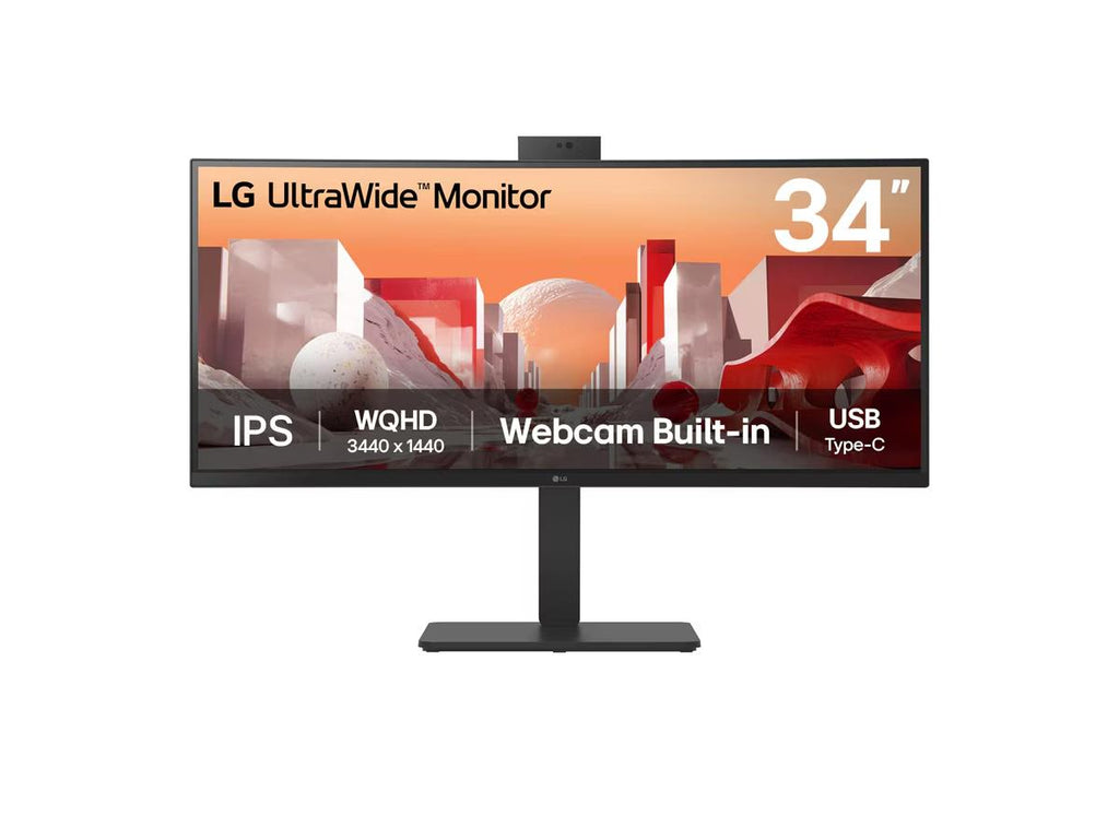 34BA85QE - 34'' UltraWide QHD Curved IPS Monitor with Built-in FHD webcam and USB Type-C - 34 WQHD (3440x1440) Curved IPS display - sRGB 99% (Typ.) / HDR10 - Built-in Full HD Webcam, mic, and speakers - USB Type-C (PD 90W) / RJ45 - Reader Mode & Flicker Safe - Tilt/Height/Swivel adjustable stand