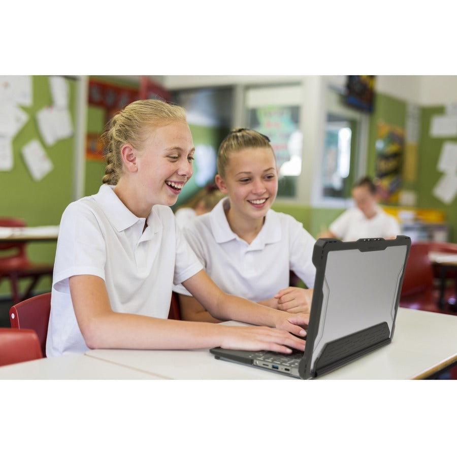 This tough, wrap-around case takes our popular Extreme Shell to new levels of protection and functionality with our new MAXGrip spine. Sporting rugged bumpers and overlap corners, the S model adds protection and functionality with an easy-grip, book-cover spine, designed to also protect the vulnerable hinge area. This wide, textured surface provides more secure carrying, delivering added insurance against drops. The rigid top and bottom panels made of compound polycarbonate, thermoplastic and polyurethane protect against scratches and impact damage. With a snug, perfect fit, the Extreme Shell-S supports all device functions and provides easy port access. Custom colors and MAXProtec antibacterial upgrade available with minimum quantity of 500 (additional fees apply).