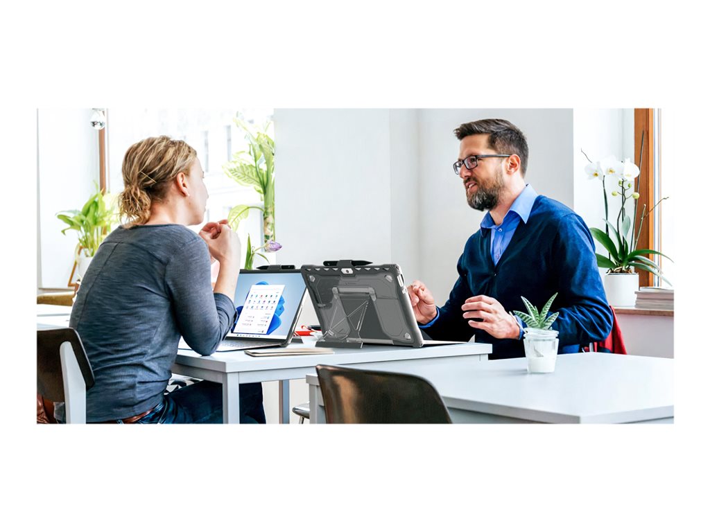 Protect Microsoft Surface Pro 8 tablets and enjoy unlimited positioning with the Shield Extreme-X2 custom-fit case with friction-hinge kickstand. The enhanced design features dual layers of tough TPU for outstanding impact and drop protection: a cushioning inner layer of TPU with an oil- and dirt-resistant outer layer. The virtually break-proof FlexStand adjusts smoothly to deliver infinitely customizable positioning, then stays securely in place. The custom-fit design delivers easy access to all ports, openings, and buttons. Durable, updated corner anchors make it easy to add an (optional) hand or shoulder strap. Seamless compatibility with the Microsoft Type Cover and stylus, or equivalent. (Keyboard cover and stylus not included.).