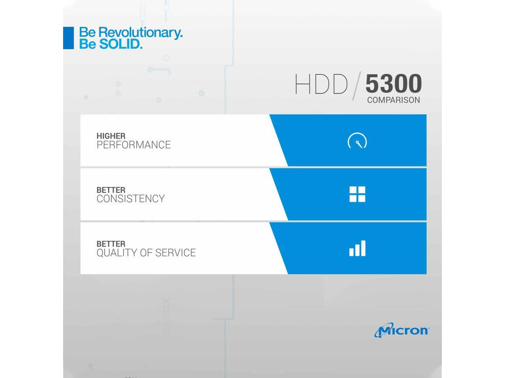 Take advantage of the Micron 5300 optimizations for read-intensive workloads. Your cloud and data centers will show strong performance for media streaming, online transaction processing (OLTP), block and object stores, business intelligence and data SS, and small random block. The Micron 5300 PRO delivers in the capacity tier on VDI/ virtualization. Refresh your data center and gain performance upgrades. Modernize your racks, stacks, and server arrays by updating your data center with the performance, consistency, and expanded data security of the Micron 5300 SSD. Its data center class SATA storage delivers robust, consistent performance at 6 Gb/s for your data center and cloud, along with sequential read speeds of 540 MB/s.