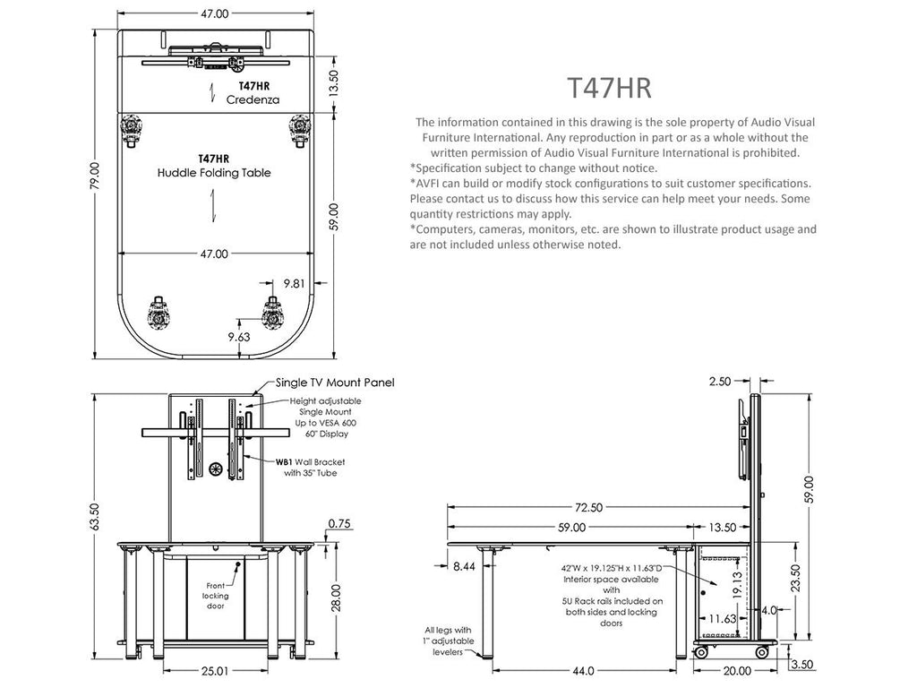 The T47HR Mobile Huddle Room Package is a great solution for quick collaboration in open spaces and meeting rooms. It offers easy setup, with the convenience of being mobile and portable. This package includes a single display mount panel with brackets, a 3-Bay Credenza equipped with Power & Data Panel and 5U rack rails per side, a Huddle Folding Table that easily connects with the Credenza and can conveniently be folded and hooked at the back for portability when not in use. Seats up to 5 people.