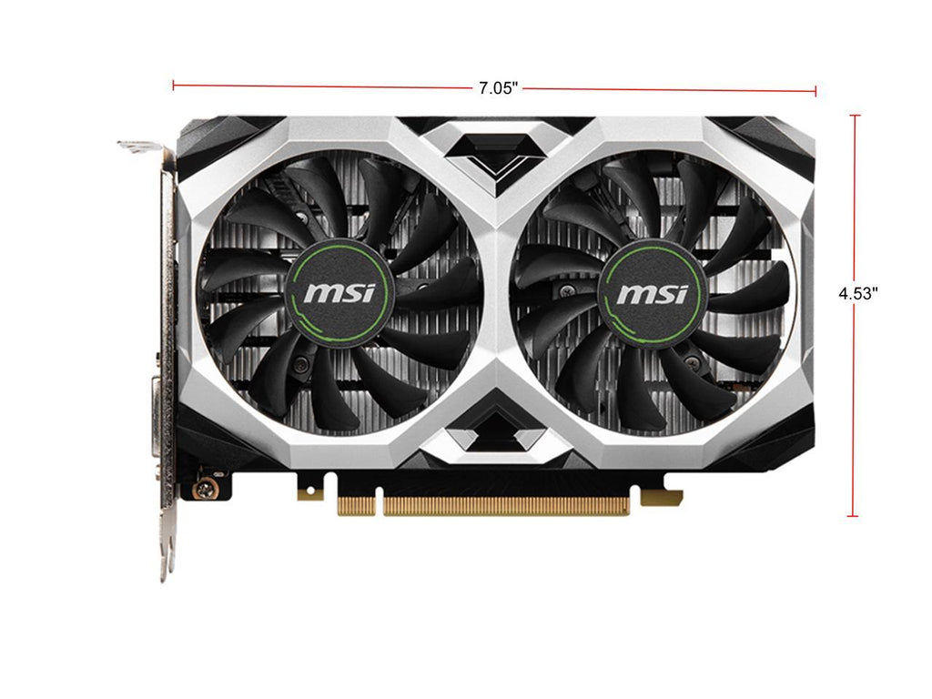 The MSI GeForce GTX 1650 D6 VENTUS XS OCV1 is factory-overclocked to 1620 MHz Boost Clock in OC Mode (1590 MHz Boost Clock for GDDR6 reference card). Dual large fans keep things cool even under heavy load, and DVI, HDMI and DisplayPort outputs offer seamless compatibility with modern display devices.