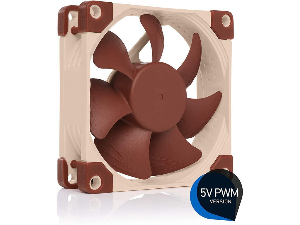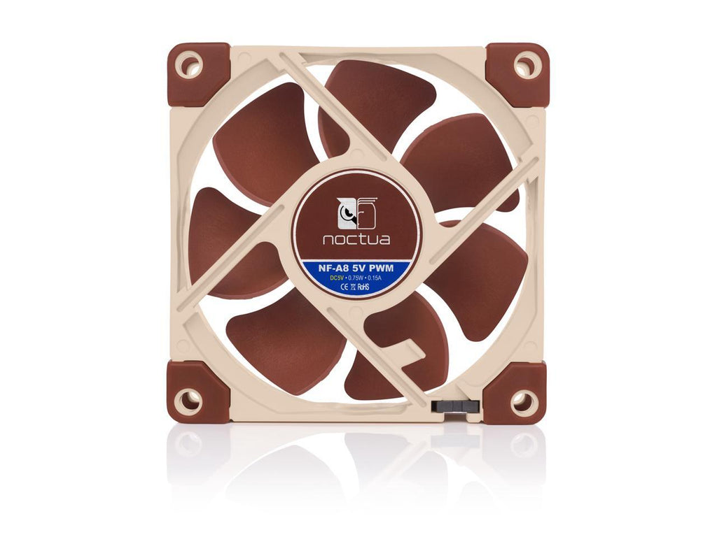 - Premium quiet fan, 80x80x25 mm, 5V, 4-pin PWM, max. 2200 RPM, max. 17.7 dB(A), >150,000 h MTTF