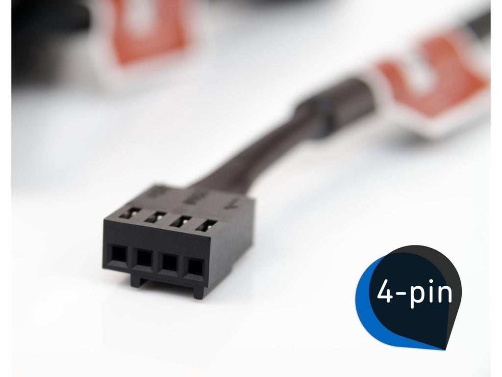 - 4-pin PWM version for automatic speed control via 4-pin PWM fan headers, broad 300-1200rpm speed range (900rpm max. with supplied Low-Noise Adaptor)