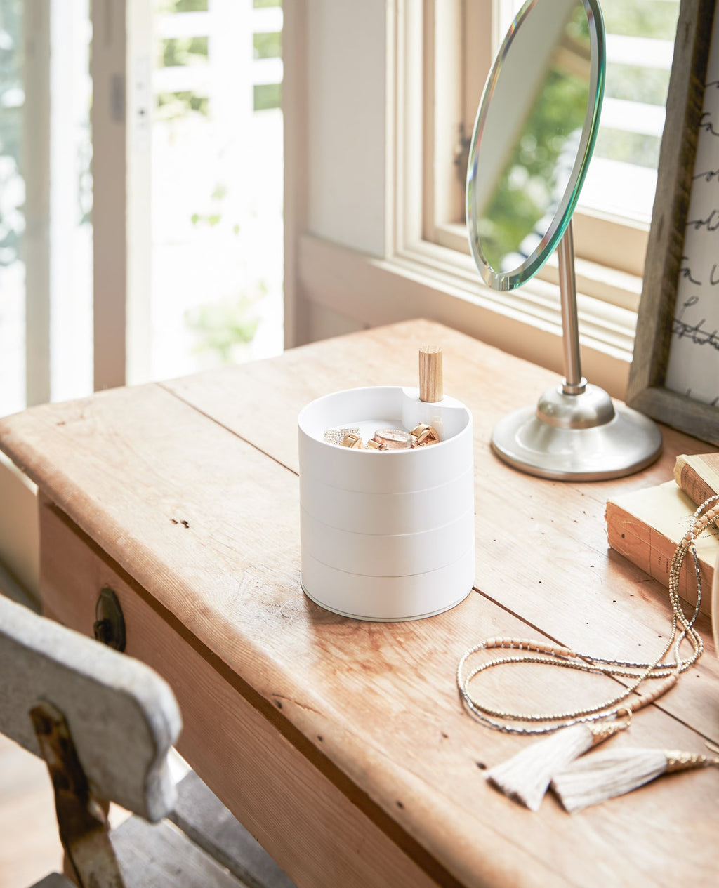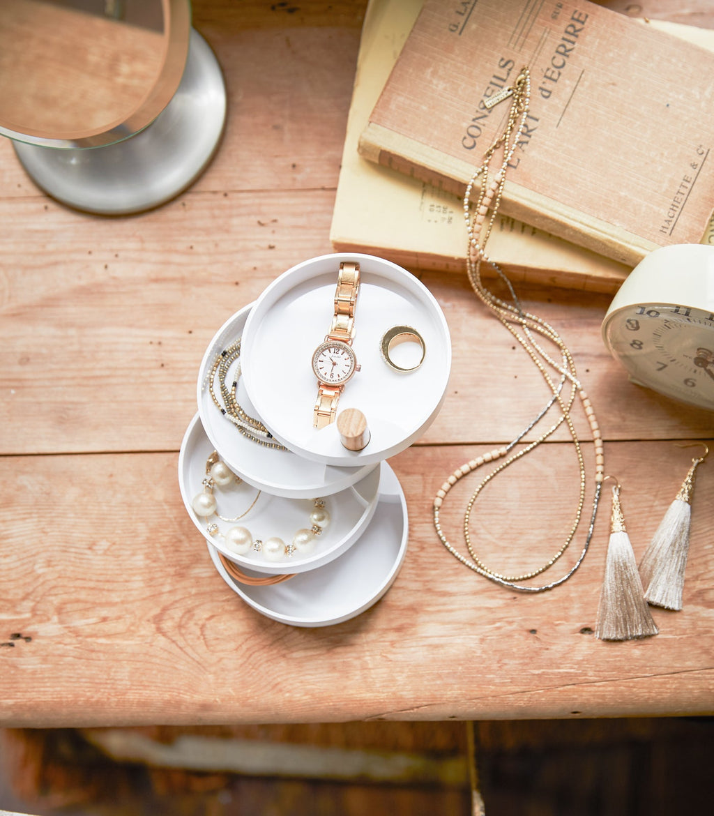 Small: Four sleek tiers swivel out so you can contain and categorize everything from watches, necklaces, earrings, and more. A compact solution for smaller items.
