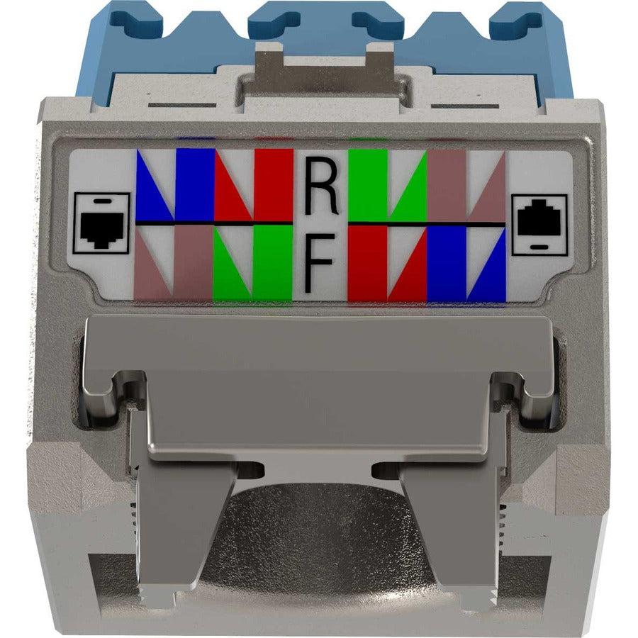 Category 6A/Class EA and Category 6/Class E, 8-position Angled Shielded Jack Module shall terminate 4-pair, 22-26AWG, 100 ohm shielded twisted pair cable and shall not require use of a punch down tool. Angled Shielded jack Modules shall provide option for either up or down, or left or right, 45° angled cable entry into rear of jack module. Angled Shielded Jack Modules shall use a forward motion termination method to optimize performance by maintaining cable pair geotmetry while eliminating condutor untwist. The termination cap shall be color-coded to designate performane level and shall include a label coded for T568B wiring scheme