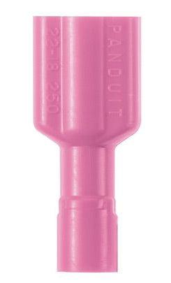 The vibration resistant DiscoGrip™ female disconnect is made of brass and is tin-plated. It is fully insulated in red premium nylon housing. It has a tab size of 0.110 x 0.032" (2.8 x 0.8 mm) and supports a wire range of 22-18 AWG (0.5-1.0 mm²). It is 0.71" (18 mm) long and 0.19" (4.8 mm) wide. The disconnect has a funnel entry barrel configuration and a butted seam barrel. It comes in boxes of 1000.