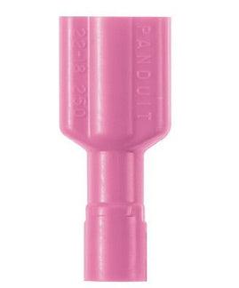 The vibration resistant DiscoGrip™ female disconnect is made of brass and is tin-plated. It is fully insulated in red premium nylon housing. It has a tab size of 0.110 x 0.020" (2.8 x 0.5 mm) and supports a wire range of 22-18 AWG (0.5-1.0 mm²). It is 0.71" (18 mm) long and 0.19" (4.8 mm) wide. The disconnect has a funnel entry barrel configuration and a butted seam barrel. It comes in bottles of 100.